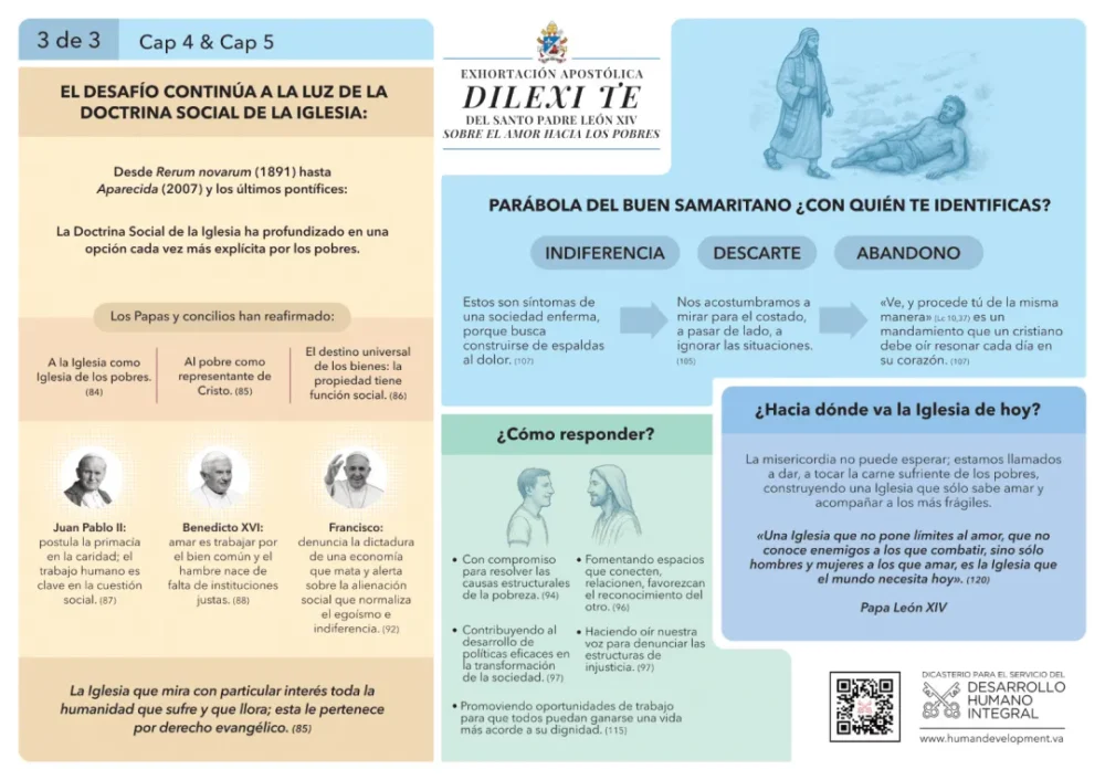 (Salvatore Cernuzio/ Vatican News. Ciudad del Vaticano, 9-10-2025).- Dilexi te («Te he amado») (Ap 3,9). El amor de Cristo que se hace carne en el amor a los pobres, entendido como cuidado de los enfermos; lucha contra la esclavitud; defensa de las mujeres que sufren exclusión y violencia; derecho a la educación; acompañamiento a los migrantes; limosna que “es justicia restaurada, no un gesto de paternalismo”; equidad, cuya falta es “raíz de los males sociales”. León XIV firma su primera exhortación apostólica, Dilexi te, un texto de 121 puntos que brota del Evangelio del Hijo de Dios, que se hizo pobre desde su entrada en el mundo y que relanza el Magisterio de la Iglesia sobre los pobres en los últimos ciento cincuenta años. “Una auténtica fuente de enseñanzas”.